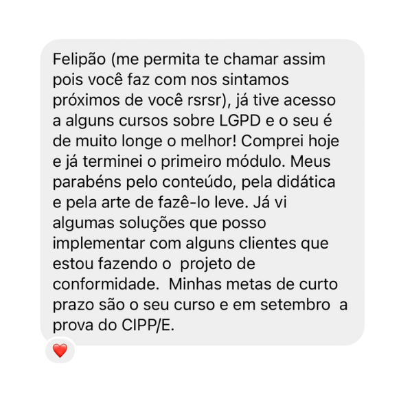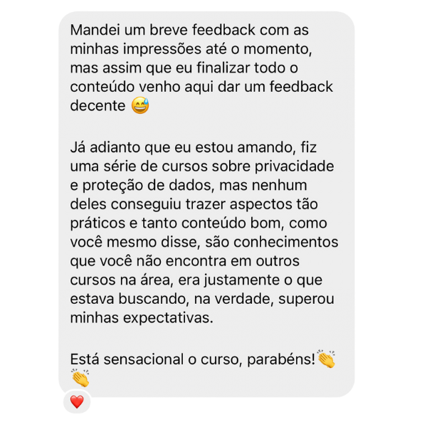 É um treinamento completo, que te apresenta toda a teoria a respeito da LGPD, em detalhes, assim como te ensina a realizar um projeto de adequação do começo ao fim, com todas as dicas relevantes para que o seu trabalho seja elogiado por seus clientes/chefes/pares e te permita cobrar honorários elevados para prestar seus serviços.